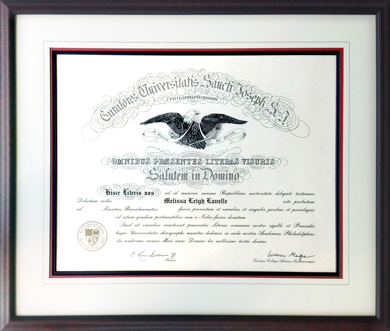 Holy Family custom framed diploma at Whispering Woods Gallery Holland Pa