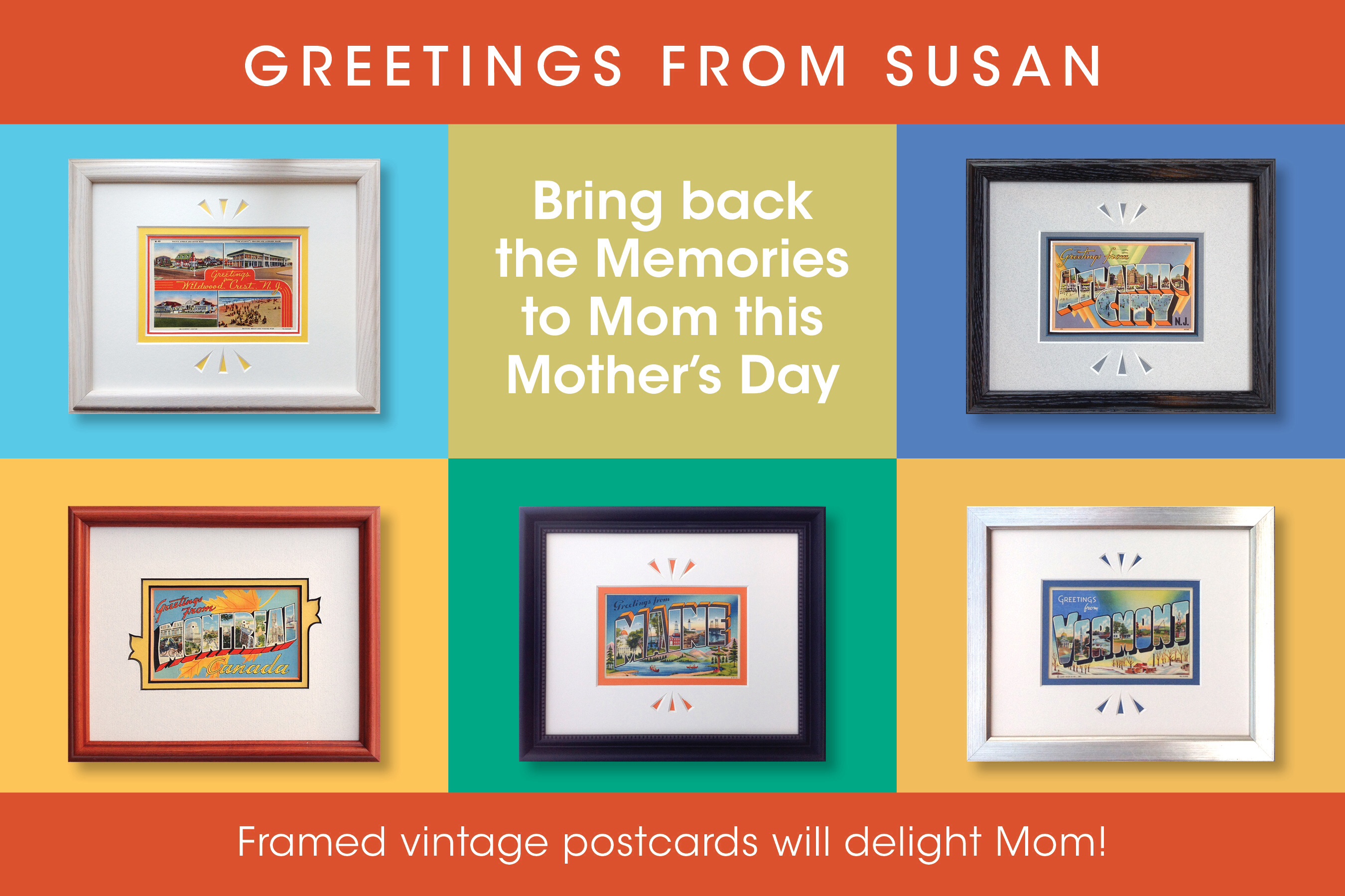 We don’t sell copies, all are authentic. We have offerings framed, matted and unmatted. We’ve set up an online Etsy shop so that all can shop with us. Feel free to visit our shop 24/7. Here is a collection of framed postcard projects created at Whispering Woods Gallery. Have an idea? Give Susan a call to create a gift they won’t forget.